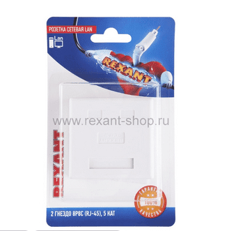 Розетка 2хRJ-45 8р-8с 5 кат. REXANT предназначена для подключения компьютерных и телефонных кабелей в сеть. Применяют такие розетки для размещения в помещениях. Розетка содержит два гнезда 5 категории RJ- 45 под разъем 8Р-8С (8 посадочных мест и 8 контактов). Кабель фиксируется с помощью зажимных контактов. Розетка имеет квадратную форму и устанавливается на стену накладным способом.