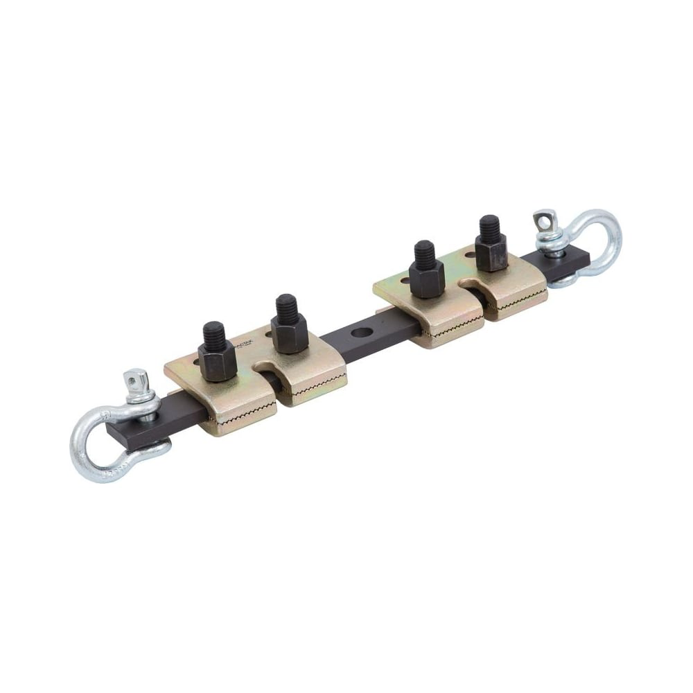 Двойной рамный кузовной зажим 3т МАСТАК 112-13205 обладает мощностью в 3 тонны и предназначается для использования в области восстановления геометрии кузова. Приспособление имеет сдвоенный широкий болтовой зажим с губками, имеющими зубчатые поверхности, и двумя серьгами, которые позволяют прилагать тяговое усилие с двух направлений. Захваты можно переставлять на основании, что способствует достижению точного позиционирования на кузове автомобиля.