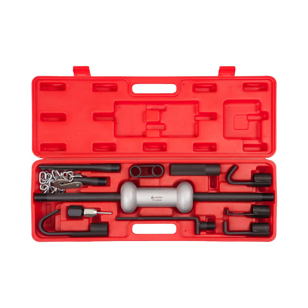 Обратный рихтовочный молоток с комплектом принадлежностей МАСТАК 117-00009C - это набор профессионального ручного инструмента, популярный в самых различных по проходимости авто-слесарных мастерских. Посредством данного комплекта можно не только восстановить первоначальную геометрию капота, крыльев и др. конструктивных элементов автомобиля, но и демонтировать прикипевшие детали.