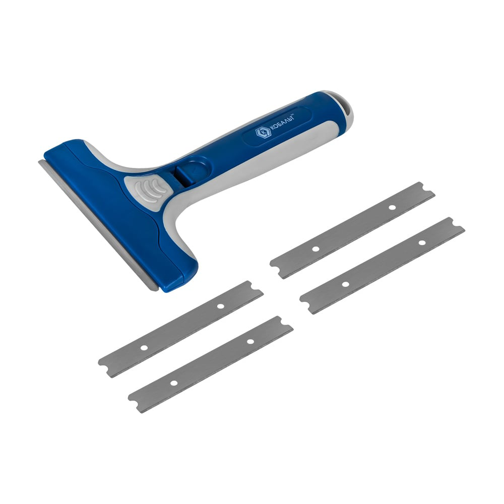 Применяется для очистки гладких поверхностей от различных загрязнений. Имеет механизм быстрой смены лезвия. В комплекте 5 запасных лезвий. Длина рукоятки 150 мм.