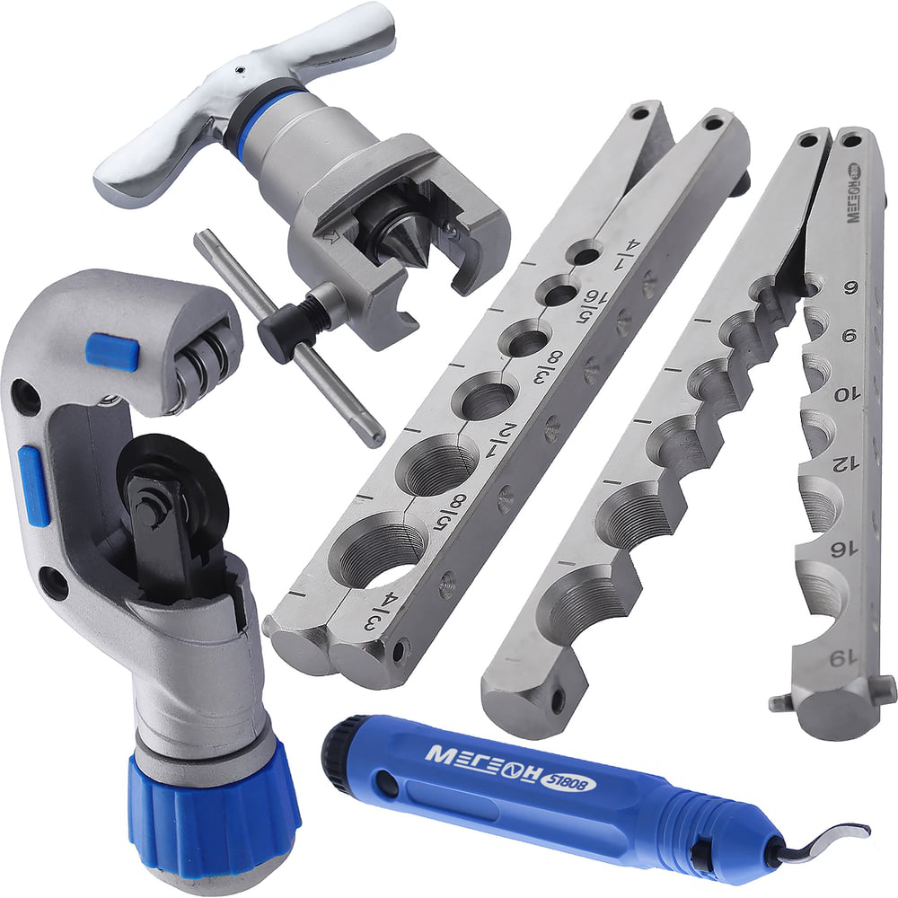 МЕГЕОН 51808 - это уникальный набор ручного слесарного инструмента, основным назначением которого является холодная развальцовка концов трубок из алюминия, меди, мягкой стали и других металлов поддающихся этому виду обработки. В комплект входит всё необходимое для проведения всех операций от подготовки до окончательной вальцовки, а именно: труборез, рассчитанный на диаметр от 4 до 32 мм, шабер предназначенный для снятия заусенцев с внутренней кромки, головка с вальцовочным конусом установленным на эксцентрике, дюймовая и метрическая матрицы. Он найдёт широчайшее применение при монтаже, ремонте и обслуживании холодильного, гидравлического, пневматического и другого оборудования и станет удачной находкой для специалиста этого профиля, а пластиковый кейс делает его удобным для хранения и транспортировки.