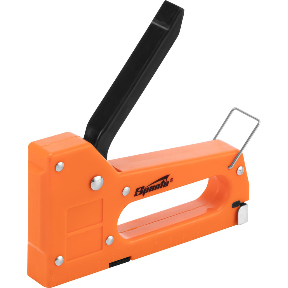 Пластиковый мебельный степлер Sparta 42001 совместим с крепежами типа 53 размером 4-8 мм и поставляется со скобами в количестве 100 шт. Используется для быстрого скрепления с деревянным основанием фанеры, оргалита, ДСП, ДВП, пленки, утеплителя и других листовых материалов. Будет полезен при сборке шкафов, обивке мягкой мебели, при выполнении теплоизоляционных и других крепежных работ.