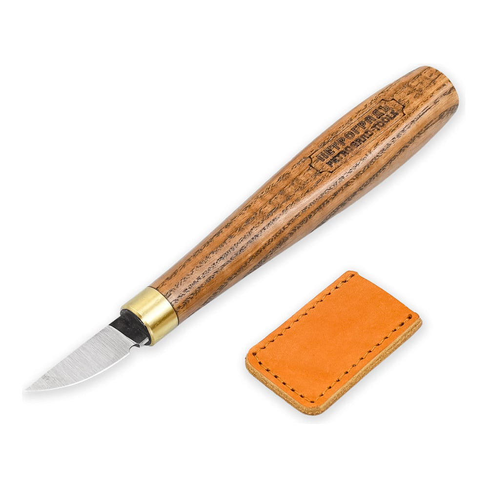 Нож с прямым обухом и изогнутой режущей кромкой отлично подходит как для съёма лишнего материала, так и для финишной работы при резьбе по дереву. Особенностью этой модели является спуск клинка от обуха. Отличный нож как для начинающих, так и для профессионалов.Удобная рукоять из твердых пород древесины. Рукоять покрыта маслом для защиты древесины. Место всада клинка укреплено латунным кольцом и закрыто кожаной вставкой. Аналог ножа для резьбы по дереву "SloydKnife". Все ножи заточены и готовы к работе.Длина лезвия40мм.Максимальная ширина лезвия – 13, 5 мм.Толщина лезвия в обухе - не больше 2мм.Лезвие выполнено из легированной стали с закалкой до твердости 59-61 HRc.Длина рукояти - 147мм.Заточка сформирована общими спусками от обуха, с микроподводом в 20 градусов