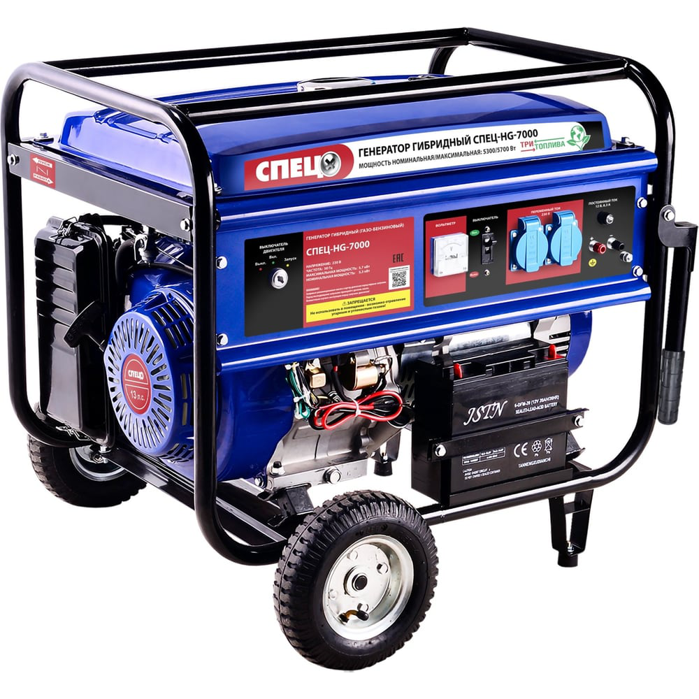 Гибридный генератор газ-бензин СПЕЦ-HG-7000 и комплект для подключения к сети+баллону предназначается для снабжения бытовых приборов или инструментов электричеством на даче, в домашней мастерской. Все элементы устройства крепятся на жесткую металлическую раму, которая образует две ручки для удобства транспортировки. В комплект поставки входят колеса для простоты перемещения по ровной рабочей площадке. Двигатель агрегата запускается про помощи ручного или электростартера. Система электронного зажигания не требует регулирования. Модель вырабатывает стабильный ток 220В 50Гц. Двигатель отличается долговечностью эксплуатации. Уровень масла легко и просто контролируется при помощи встроенного датчика, что успешно препятствует преждевременному износу внутренних элементов. Русскоязычная панель управления облегчает использование устройства. Металлическая рама снижает риск негативного механического воздействия на агрегат. В качестве топлива используется не только бензин АИ-92 и сжиженный газ в баллонах (пропан-бутан), но и магистральный газ (метан). Наличие клемм 12 В дает возможность подзарядки аккумуляторной батареи.