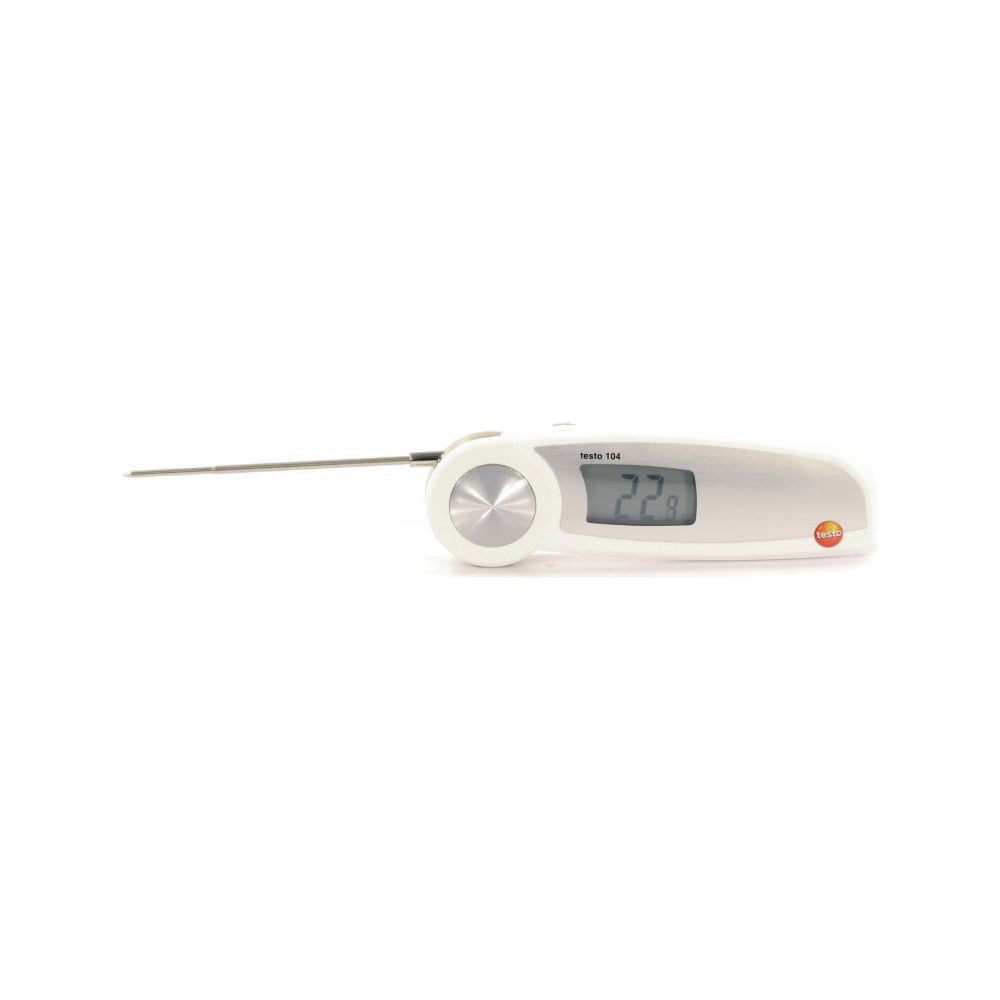 Термометр с убирающимся зондом Testo 104 00-00311458 0563 0104 – водонепроницаемый измерительный прибор со складным щупом, сертифицированный для проведения измерений температуры продуктов питания. Используется для контактного измерения температуры в пищевых продуктах в магазинах, на производствах и складских помещениях. С ним легко работать – оснащён одной кнопкой. Погружной датчик температуры выполнен из нержавеющей стали – не окисляется при контакте с продуктами питания. При длине 102 мм он может глубоко проникать в сыпучие, жидкие и полутвёрдые продукты. Все данные выводятся на ЖК-дисплей для безошибочного считывания информации. Измеритель работает от аккумуляторных батарей типа ААА. Батареи/напряжение – 2 AAA микро батарейки.