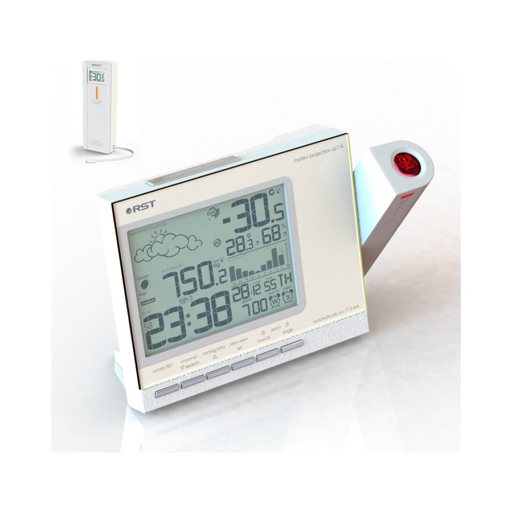 Проекционная метеостанция с дистанционным терморадиодатчиком RST RST32774 предназначена для отображения на потолке или стене в темное время суток показателей точного времени и даты, температуры воздуха в помещении и на улице. Метеостанция получает данные от радиодатчиков, передающих данные на расстояние до 50 м (при отсутствии помех). Предусмотрена регулировка поворота, направления и дистанции проекции. Можно автоматически устанавливать время и дату по сигналам точного времени rcc 77,5.