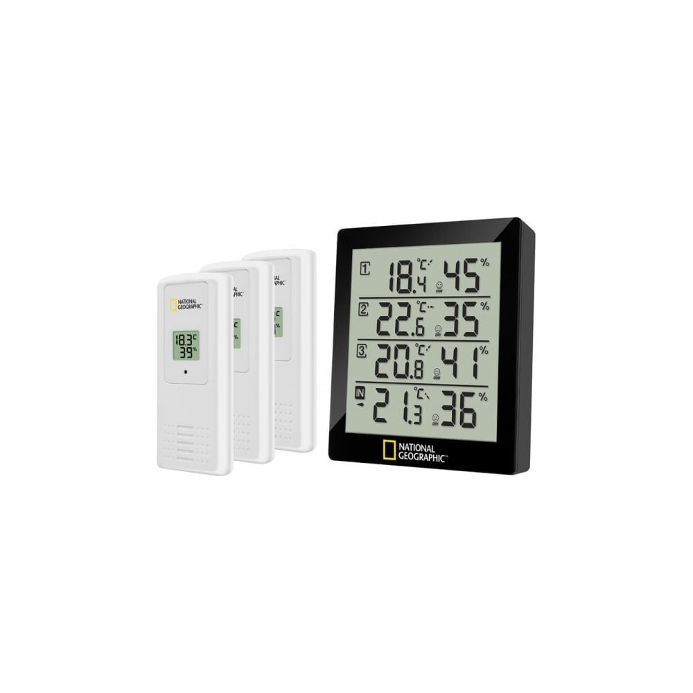Термогигрометр Bresser National Geographic комплектуется тремя дополнительными радиодатчиками, поэтому способен проводить измерения температуры и влажности воздуха в четырех местах одновременно. Все показания отображаются на встроенном экране крупно и четко. Кроме того, на нем показывается и индикатор общего уровня комфорта: небольшой смайлик улыбается, когда все хорошо, и расстраивается, когда метеоусловия неблагоприятны. Датчики можно размещать внутри или снаружи помещения, так как они защищены от воздействия влаги. У каждого датчика есть собственный экран, на котором отображаются проводимые им измерения. Кроме того, данные передаются на метеостанцию - радиус радиосигнала составляет 30 метров.