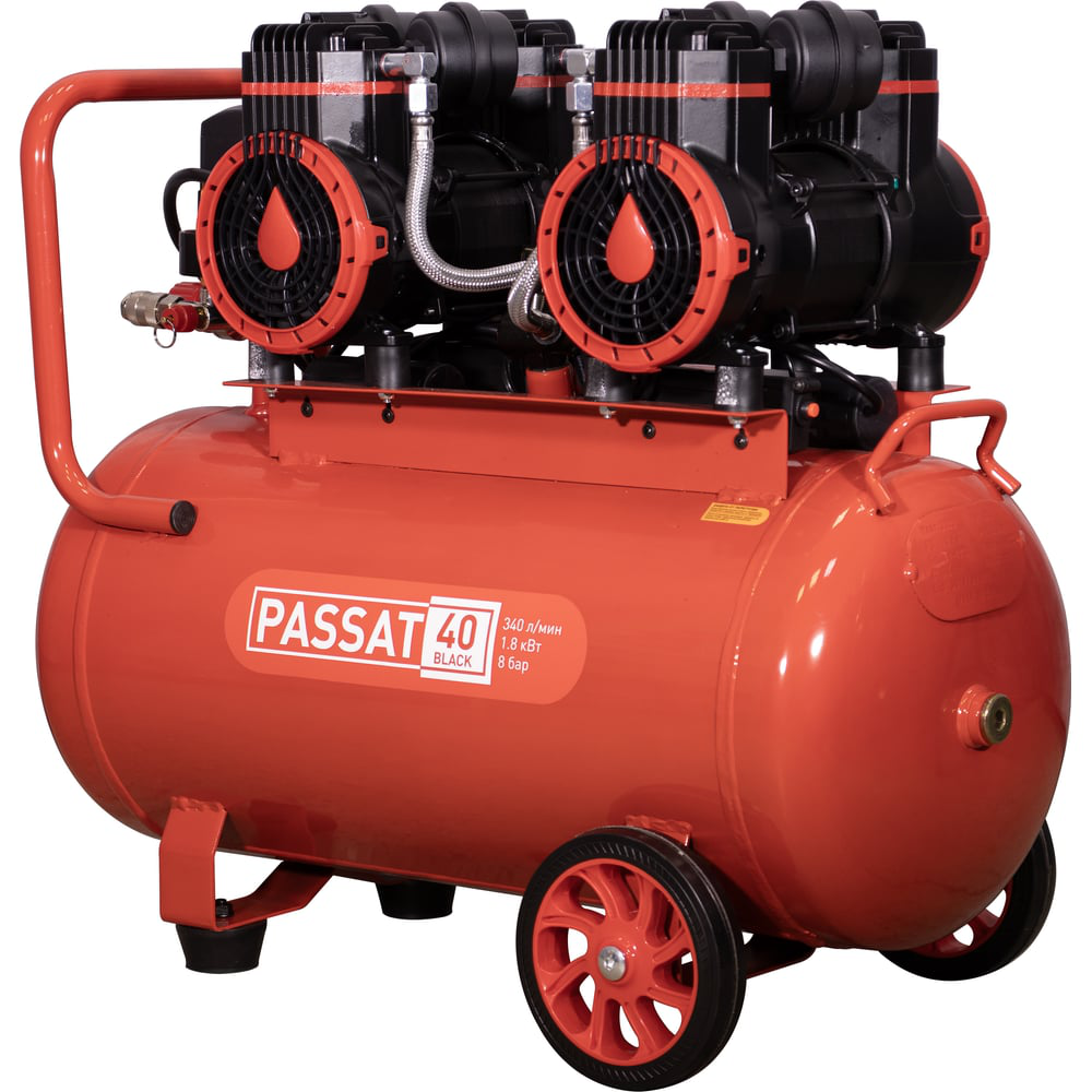 PASSAT BLACK – линейка поршневых безмасляных компрессоров со сниженным уровнем шума и высокой производительностью. «Сухие» компрессоры PASSAT будут востребованы в быту, в небольшой мастерской в медицине или на пищевом производстве. Спаренные блоки цилиндров, установленные по двум сторонам электродвигателя, делают систему сбалансированной. В конструкции поршневых групп компрессоров PASSAT BLACK используются тефлоновые поршневые кольца с небольшим коэффициентом трения и высокой износоустойчивостью. Благодаря этому температура компрессорной «головы» всегда остаётся низкой, что гарантирует высокий ресурс трущихся частей и является дополнительной мерой защиты оператора. Компрессоры PASSATсерииBlack могут работать без перерывов на протяжении всего рабочего дня. Согласно данным испытаний лаборатории, образцы, отработавшие 800 часов на давлении 6 Бар - по факту инспекции, не имели следов износа колец. Плановое обслуживание рекомендовано заводом через 1200 часов наработки без требования цикличного режима эксплуатации. Особенности ресивера: Честный объём ресивера Бак из стали 2.5мм., отвечающий всем требованиям европейской сертификации Ревизионные отверстия с 2х сторон ресивера Возможность подключения пневмолинии напрямую к ресиверу для снижения потерь при прохождении через штуцеры и дополнительные коннекторы PASSAT-40 BLACKоснащен: - двумя быстросъёмными соединениями рапид («мама», евростандарт) - регулятором давления с манометром и предохранительным клапаном - фильтрами входящего воздуха
