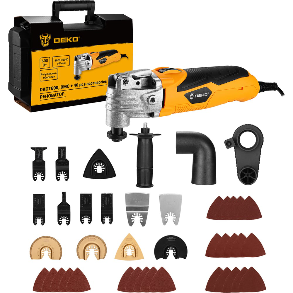 Реноватор DEKO DKOT600 в кейсе с набором аксессуаров 40 штпредназначен для пиления, резки, шабрения и шлифования в труднодоступных местах, таких как углы и кромки,вырезания отверстий, распиливания небольших заготовок, шлифования, полирования и зачищения различных поверхностей. Технические характеристики: Напряжение: 220-240 В Частота: 50 Гц Мощность: 600 Вт Частота колебаний: 11000-23000 кол/мин Регулировка оборотов: да Тип соединения: OQIS Угол колебаний:3,2°