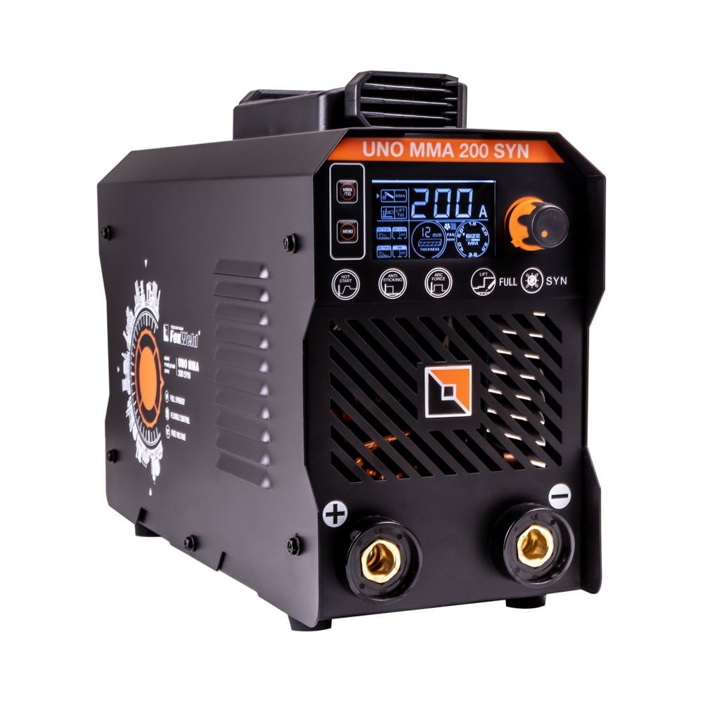 Аппарат Foxweld UNO MMA 200 SYN относится к классу профоборудования для сварочных процессов покрытым электродом (MMA) и вольфрамовыми электродами в среде инертного газа Аргон (TIG LIFT)(поджиг дуги касанием). В серии моделей UNO SYN есть полноценная синергетика, которая рекомендует параметр силы тока сварки к толщине свариваемого сплава металла. Задать параметры сварки можно при помощи 2 кнопок и шаговой ручки регулировки. С помощью 1 кнопки выбирается режим сварки: MMA или TIG LIFТ. Вторая кнопка позволяет переключать параметры сварки, а при помощи плавного вращения ручки выставляются числовые значения. Вращение ручки осуществляется «шажками». Можно точно выставить значения параметра, что очень удобно. На лицевой панели есть цветной экран, на котором отражены процессы и параметры сварки, устанавливаются значения настроек. Монитор покрывает плотная защитная плёнка. Аппарат работает от сети 140 - 270 В, процесс сварки при этом стабилен. В ИП включается и отключается функция VRD (снижение напряжения холостого хода до параметров, которые не угрожают жизни человека). Значение напряжения при действующем VRD =17 В. Байонеты мощные, надёжные (35-50), позволяют с минимальными потерями снять всю мощность сварочного тока.