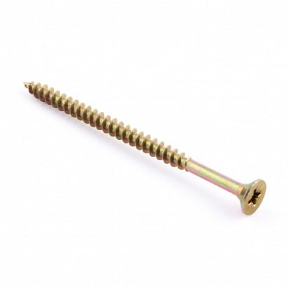 Саморез универсальный, покрытие - желтый цинк. Применяется для прямого крепления различных изделий к деревянным конструкциям и к прочным материалам (бетон, кирпич, камень) через дюбель. Также применяются совместно с любыми видами пластиковых дюбелей (для полнотелых и пустотелых конструкций), для сборки деревянных конструкций и металлических конструкций (с предварительным сверлением). Желтый цинк считается более прочным покрытием. Часто применяется в отделке в местах, где шляпка остается видимой.