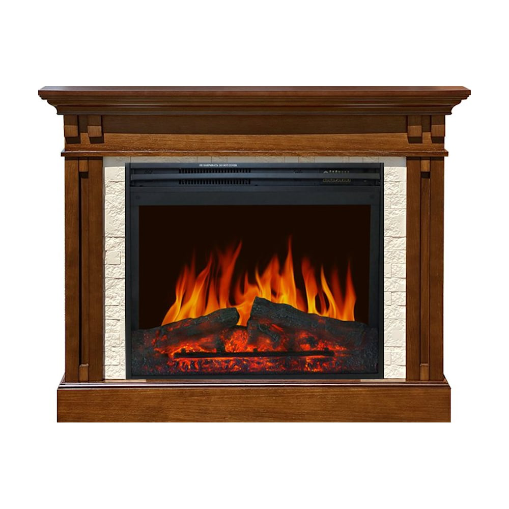 Каминокомплект сочетает в дизайне разные материалы – дерево в корпусе и искусственного камень в зоне очага. Для воссоздания иллюзии огня в очаге используются высокотехнологичные визуальные эффекты, светодиодные поленья в новом дизайне и звуковая имитация потрескивания дров.