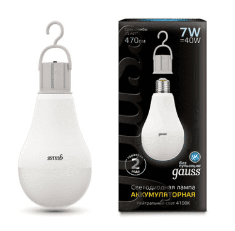 Лампа Gauss LED A60 7W E27 470lm 4100K с Li-Ion аккумулятором 102402207 Световой поток: 470Цветовая температура: 4100К
