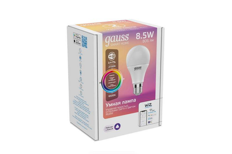 Светодиодная умная лампа Gauss A60 Smart Light RGBW E27 A60 8,5 Вт 2700-6500K, 1170112 - это инновационный и умный источник освещения для вашего дома. Лампа оснащена технологией RGBW, позволяющей создавать разноцветное освещение, а также регулировать цветовую температуру от теплого белого до холодного белого света (2700-6500K). С помощью приложения на смартфоне вы сможете управлять яркостью, цветом и расписанием работы лампы, создавая уютную атмосферу в любом помещении. Лампа имеет цоколь E27, мощность 8,5 Вт и долгий срок службы, что делает ее отличным выбором для вашего дома.