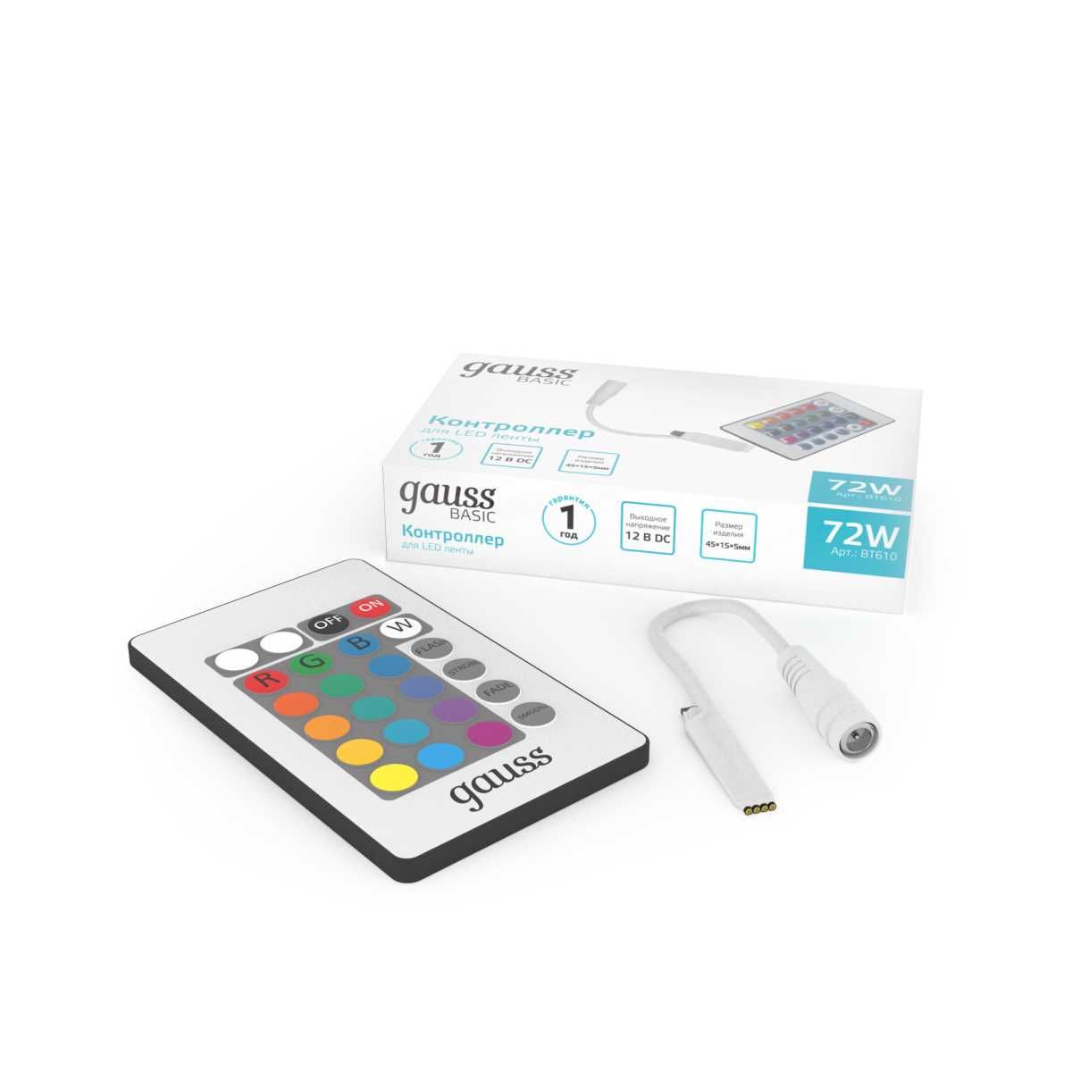 Расширенная гарантия на товар составляет 12 месяцев. поставщик рекомендует использовать лампы накаливания с цоколем не указан для освещения площади не указана м2. Контроллер RGB для светодиодной ленты Gauss Basic LED 12V 72W BT610 в современном стиле используется в интерьере не указан с установкой не указано.