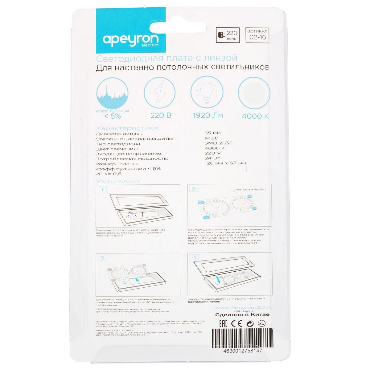 Расширенная гарантия на товар составляет 12 месяцев. поставщик рекомендует использовать лампы накаливания с цоколем не указан для освещения площади не указана м2. Светодиодный модуль Apeyron 02-16 в современном стиле используется в интерьере не указан с установкой не указано.