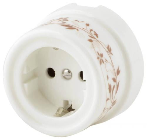 Новинка сезона - отличительная черта розетки – окантовка из драгоценного металла - золото.Ретро розетка под старину с заземляющим контактом и подъемной рамкой для внутренней* и наружной проводки.
