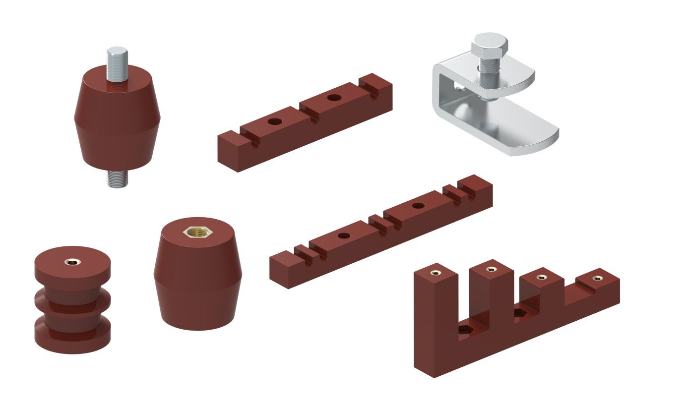 · изоляторы. Крепят токоведущие шины, неподвижно фиксируют и изолируют части под напряжением. Для их производства используется диэлектрический пластик и армированное стекловолокно. В инструмент армируют латунные гайки.