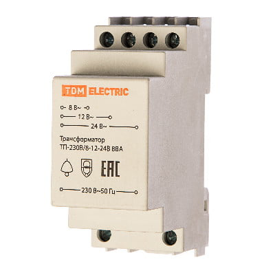 Трансформатор понижающий (звонковый) ТП-230В/8-12-24В 8ВА DIN-рейка TDM 2 модуля - это компактное устройство, предназначенное для понижения напряжения переменного тока сети 230В до уровня 8-12-24В. Обладая мощностью 8ВА, данный трансформатор идеально подходит для использования в системах звонков или других устройствах, требующих низкое напряжение.Устройство устанавливается на DIN-рейку и занимает всего 2 модуля, что обеспечивает удобство при монтаже в распределительных щитах или электрощитовых.