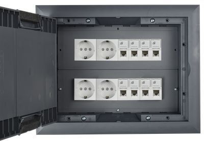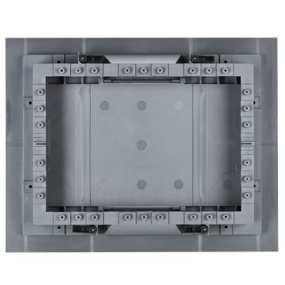 Лючок напольный ONFLOOR 24. Предназначен для организации рабочих мест в офисных или административных помещениях. В лючок можно установить до 24 модулей (12 постов 45х45 мм / 24 модуля 45х22,5). Возможна установка лючка в фальшпол толщиной от 10 до 40 мм, необходимое монтажное отверстие для установки лючка 218х288 мм, либо в бетонный пол с обязательным использованием коробки напольной: KNU-80-16-PA-9011 (рама лючка крепится на коробке напольной с помощью винтов, которые поставляются в комплекте). Крышка лючка имеет небольшое углубление, усиленное стальным листом, для монтажа напольного покрытия с максимальной толщиной 7 мм (рекомендуемые напольные покрытия - ковер или ламинат). Крышка содержит 2 откидных вывода с мягким материалом, которые позволяют организовать вывод кабелей из лючка. Степень защиты IP30 - коробка не предназначена для влажной уборки. Конструкция лючков рассчитана на максимальную нагрузку 1500Н. Комплект поставки: Лючок напольный ONFLOOR 24 - 1 шт., трафарет для финишного покрытия - 1 шт., комплект крепежа - 1 компл. Рамки для установки ЭУИ и коробки для установки лючка в бетонный пол приобретаются отдельно. Цвет: тeмно-серый RAL 7012. Пример комплектации лючка: 8 модулей: 1 шт. - KNR-80-00-7012, 1 шт. - KNP-80-16-PA-7012, 1 шт. - KNR-80-45-7012; 16 модулей: 2 шт. - KNP-80-16-PA-7012, 2 шт. - KNR-80-45-7012; 24 модуля: 2 шт. - PM-LN10D-RP-12-K03.
