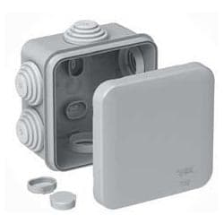 Распределительная коробка открытой установки, круглая. Коробка с защелкивающейся крышкой. С четырьмя небольшими ступенчатыми сальниками для ввода кабелей и гофротруб.