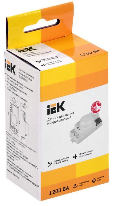 Микроволновый датчик движения излучает высокочастотные электромагнитные волны (частота волн обычно она составляет 5,8ГГц), которые отражаются от окружающих объектов и регистрируются сенсором. В случае обнаружения малейших изменений электромагнитных волн, микропроцессор датчика приводит в действие заданные настройки. Назначение: - для автоматического включения и отключения нагрузки в заданном интервале времени при появлении движущихся объектов в зоне обнаружения датчика. Применение: - управление уличным освещением; - управление внутренним освещением; - управление устройствами сигнализации.
