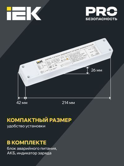 Блок аварийного питания (БАП) предназначен для обеспечения бесперебойного резервного освещения помещений светодиодными светильниками в случае непредвиденного отключения сети 230В. Питает постоянным напряжением 220В светодиодные светильники различных конфигураций, независимо от расположения драйвера (внутри или снаружи светильника). Возможно подключение несколько светильников к одному блоку. Общая мощность нагрузки 40Вт. Световой выход на каждом светильнике - 100%. Блок аварийного питания IEK состоит из электронного пускорегулирующего аппарата (конвертера), герметичной никель-кадмиевой аккумуляторной батареи, светодиодного индикатора наличия сети и подзарядки аккумулятора с кнопкой "ТЕСТ".