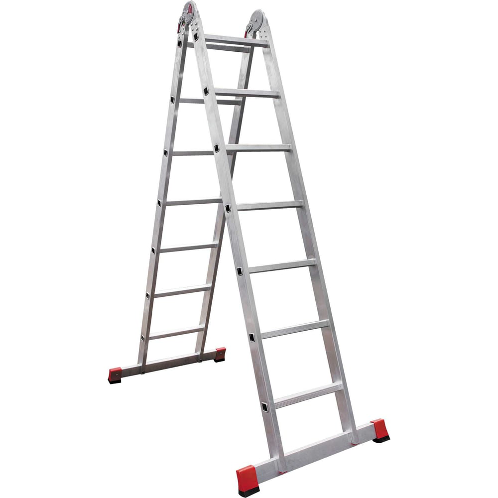Увеличенные рифлёные перекладины 28×28 мм для надёжного сцепления. Вальцовочное крепление перекладин. По прочности не уступает сварке. Шарнирные замки с автоматической фиксацией регулируются одной рукой. Пластиковые вставки для надёжного крепления траверс, предохранения профиля лестницы и окружающих поверхностей от повреждений. Башмаки траверс из 2х-компонентного пластика с прорезиненной опорой. Не скользят и не повреждают поверхность. Компактно складывается для хранения и транспортировки. В сложенном состоянии занимает мало места.
