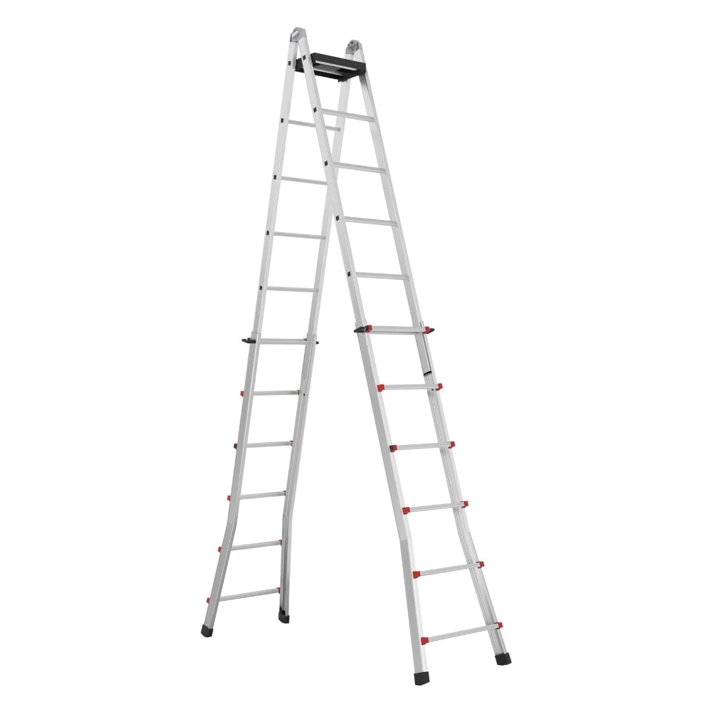 Лестница-стремянка из экструдированного алюминия с ребрами жесткости, с телескопическим удлинением и расширенным основанием создана для профессионального использования и хобби, можно использовать как приставную с высотой 6.35 м, стремянку или устанавливать на лестничных пролетах. Алюминиевые петли с тремя положениями быстрого позиционирования: Открывать и закрывать лестницу в положении «стремянки» без использования петель. Зафиксировать открытую лестницу в положении «стремянки», при помощи петель. Открыть лестницу в положении «приставная», при помощи петель.