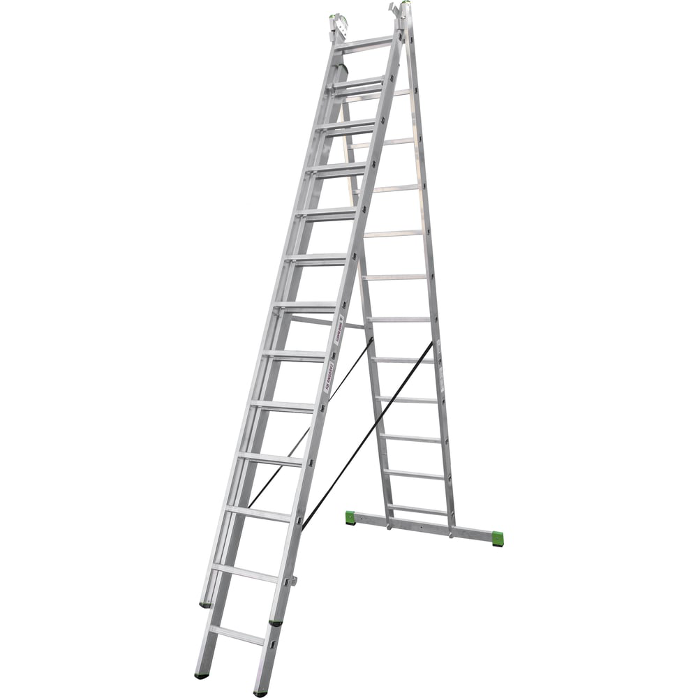 Алюминиевая трехсекционная лестница Новая Высота 3х12 ступеней 2230312 применяется для выполнения работ на высоте. Может использоваться в качестве приставной лестницы, приставной раздвижной лестницы, стремянки и стремянки с выдвижной лестницей. Предусмотрена функция "лестничный пролёт" - возможность установки на разноуровневой поверхности. Надежность. Стойки и ступени выполнены из экструдированных алюминиевых профилей. Рифлёные ступени для безопасного подъёма и спуска. Алюминиевые направляющие кронштейны для надёжного удержания выдвижной секции. Широкая поперечная траверса 750 - 1400 мм для максимальной устойчивости.