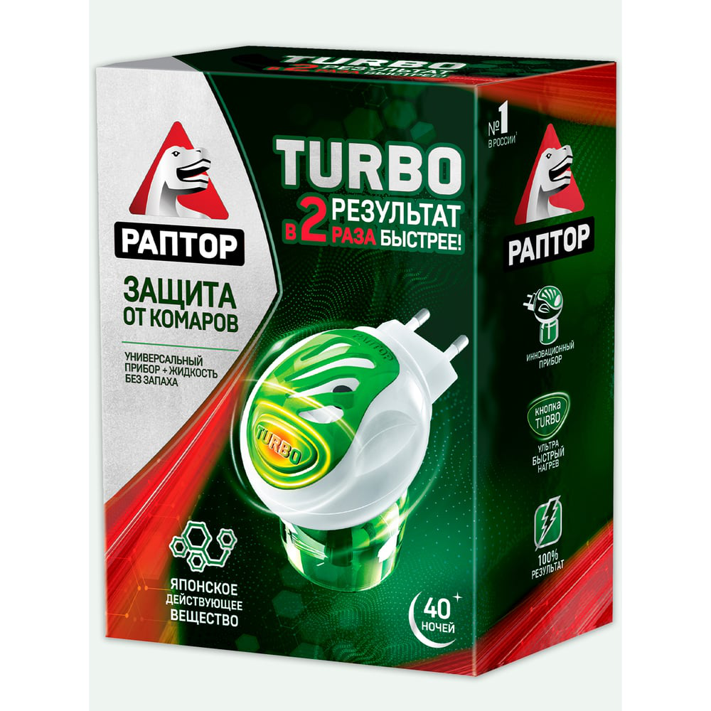 Комплект от комаров РАПТОР TURBO 40 ночей, прибор+жидкость 21861 Gk9560T работает как с пластинами, так и с жидкостью. Имеет режим TURBO, который позволит быстро избавится от комаров.