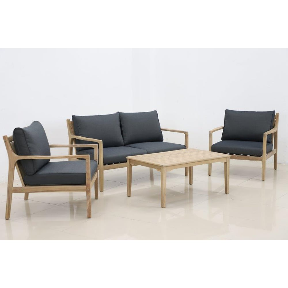 Материал — массив акации, отделка экомаслом светлый ТикАнодированная фурнитура из нержавеющей сталиПодушки в комплекте, ткань подушек – Olefin, цвет темный графит