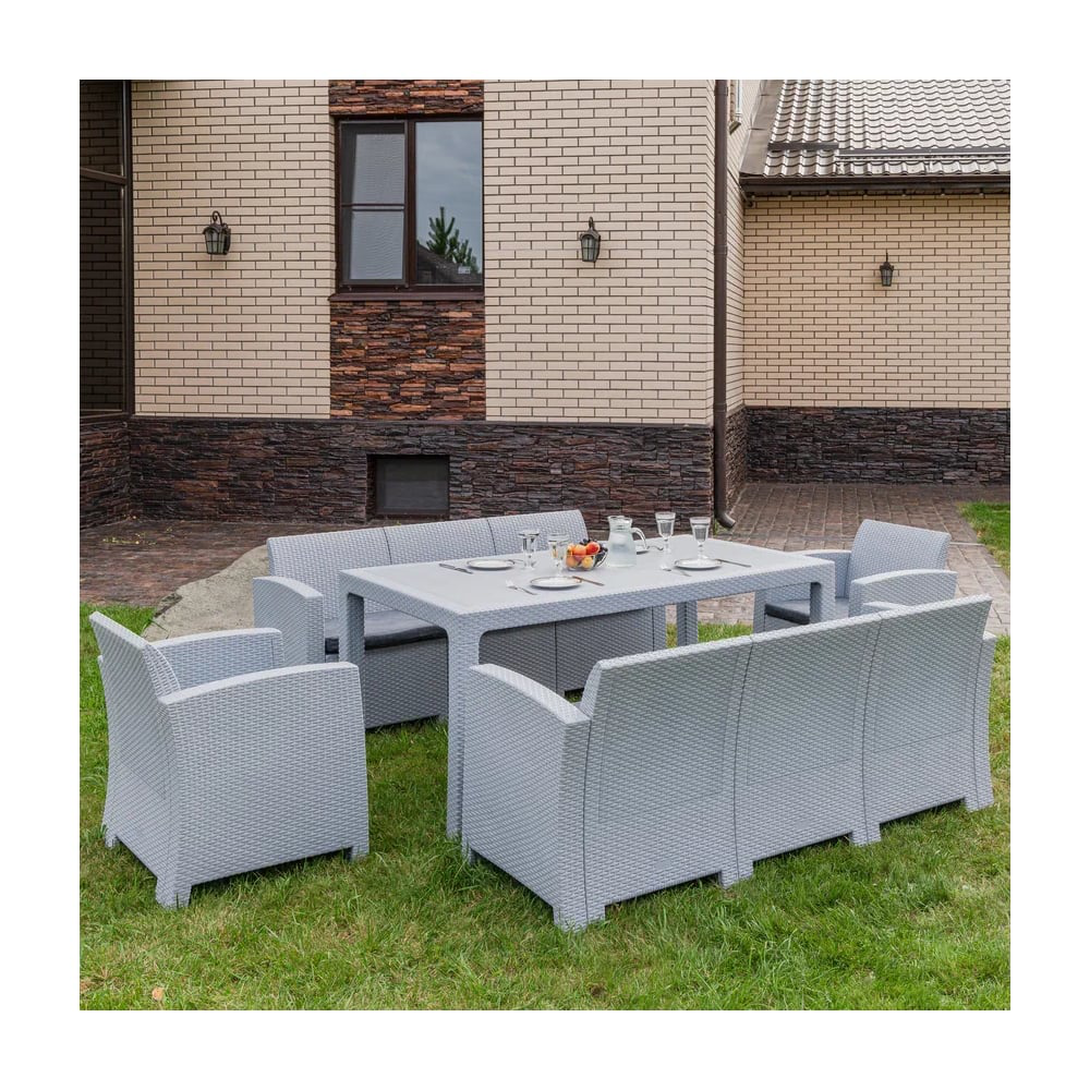 Габариты и комплектация:Обеденный стол - 165x95x75 смКресла (2 шт.) - 68х66х76 смТрехместный диван (2 шт.) - 172,5х66х76 смМатериалы:Материал комплекта - окрашенный в массе полипропилен с повышенной прочностьюЦвет комплекта - светло-серыйЦвет подушек - светло-серыйМатериал чехлов подушек - полиэстерМатериал наполнителя подушек - поролон Дополнительная информация:Количество посадочных мест – 8 человекМаксимальная нагрузка на посадочное место - 120 кгПоставляется в разобранном видеПодушка в комплекте - даТемпературный режим - от -50C до +50C