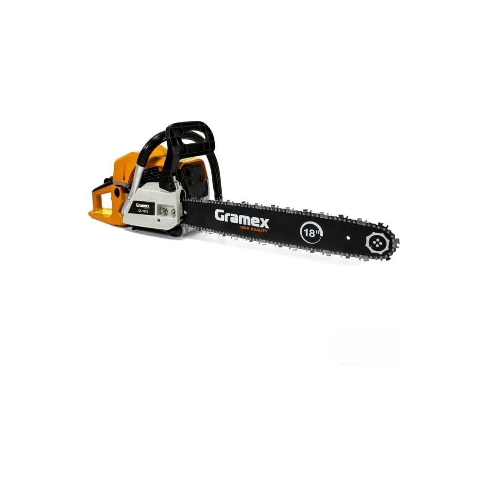 Бензиновая цепная пила Gramex CS-1835 представляет собой надежный инструмент для бытового использования, обладающий мощностью 2,5 кВт (3,5 л.с.) и двухтактным двигателем объемом 52 куб.см. Она оснащена шиной длиной 45 см (18 дюймов) и цепью с шагом 0,325 дюйма, что позволяет эффективно справляться с различными задачами по распиловке. Пила имеет легкий запуск и праймер, что облегчает ее использование, а также бесключевую регулировку натяжения цепи, что упрощает обслуживание. Виброзащита обеспечивает комфортную работу, снижая нагрузку на руки. Компактные габариты и вес 6,36 кг делают пилу удобной в транспортировке и хранении.
