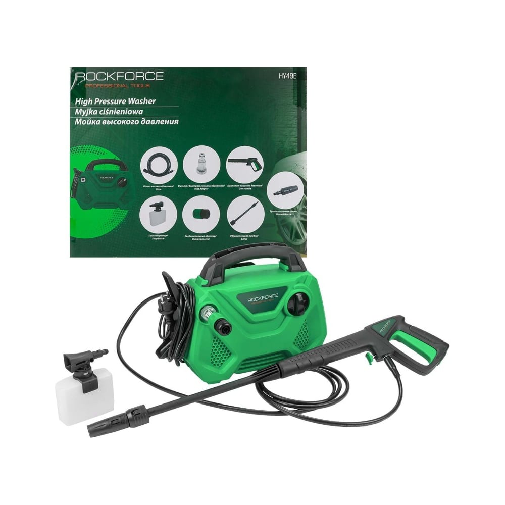 Электрическая мойка высокого давления от бренда Rockforce предназначена для эффективной очистки различных поверхностей от грязи, пыли, масла, краски и других загрязнений.ХарактеристикиМощность двигателя: 1400 Вт.Номинальный расход воды: 5 л/мин.Номинальное давление: 70 бар.Длина шнура питания: 5 м.Длина шланга: 3 м.Фильтр с быстросъемным соединением:Обеспечивает легкую и быструю очистку от загрязнений.Генератор пены в комплекте:Позволяет создавать обильную пену для более эффективной очистки.Материалы:Насос из алюминия, корпус и детали (пистолет, удлинительная труба) из пластика для надежности и долговечности.Бачок для моющего средства:Упрощает использование моющих средств во время работы.Система автоматической остановки:Предотвращает перегрев двигателя и продлевает срок службы устройства.ПрименениеМойка подходит для широкого спектра задач: от очистки автомобилей и мотоциклов до фасадов зданий и тротуаров. Идеальна как для домашнего использования, так и для промышленных объектов.